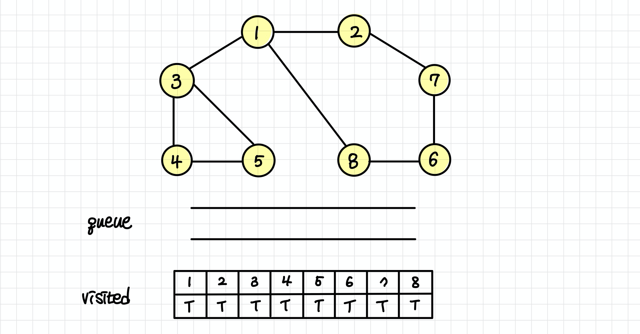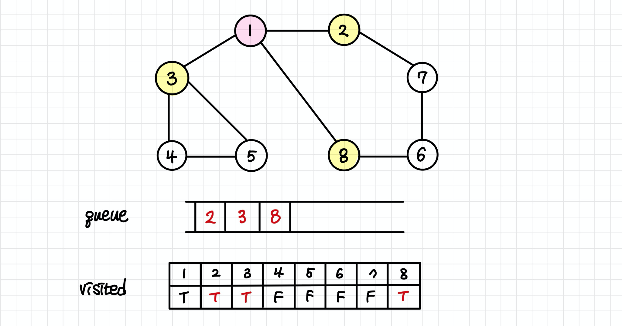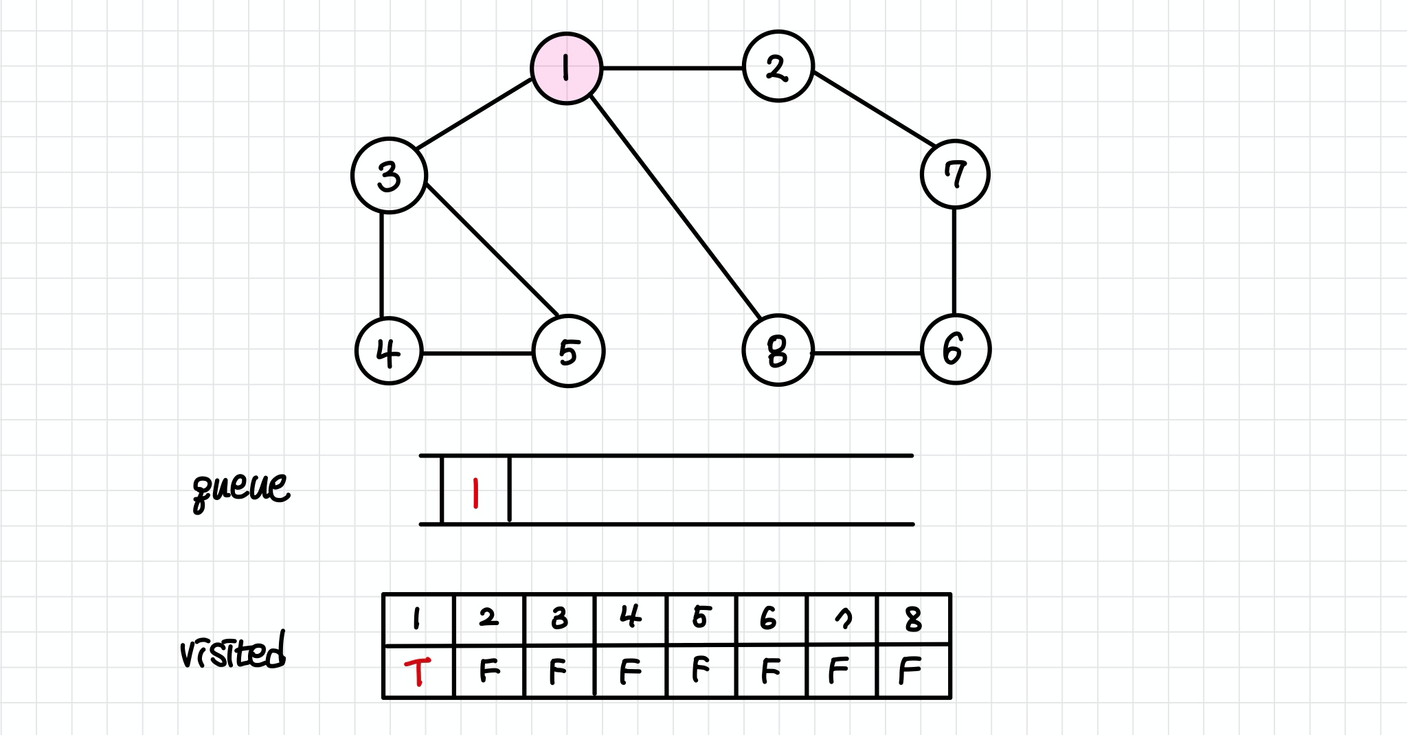 2. 큐에서 노드를 꺼내 해당 노드의 인접 노드 중에서 방문하지 않은 노드를 모두 큐에 삽입하고 방문 처리를 한다.