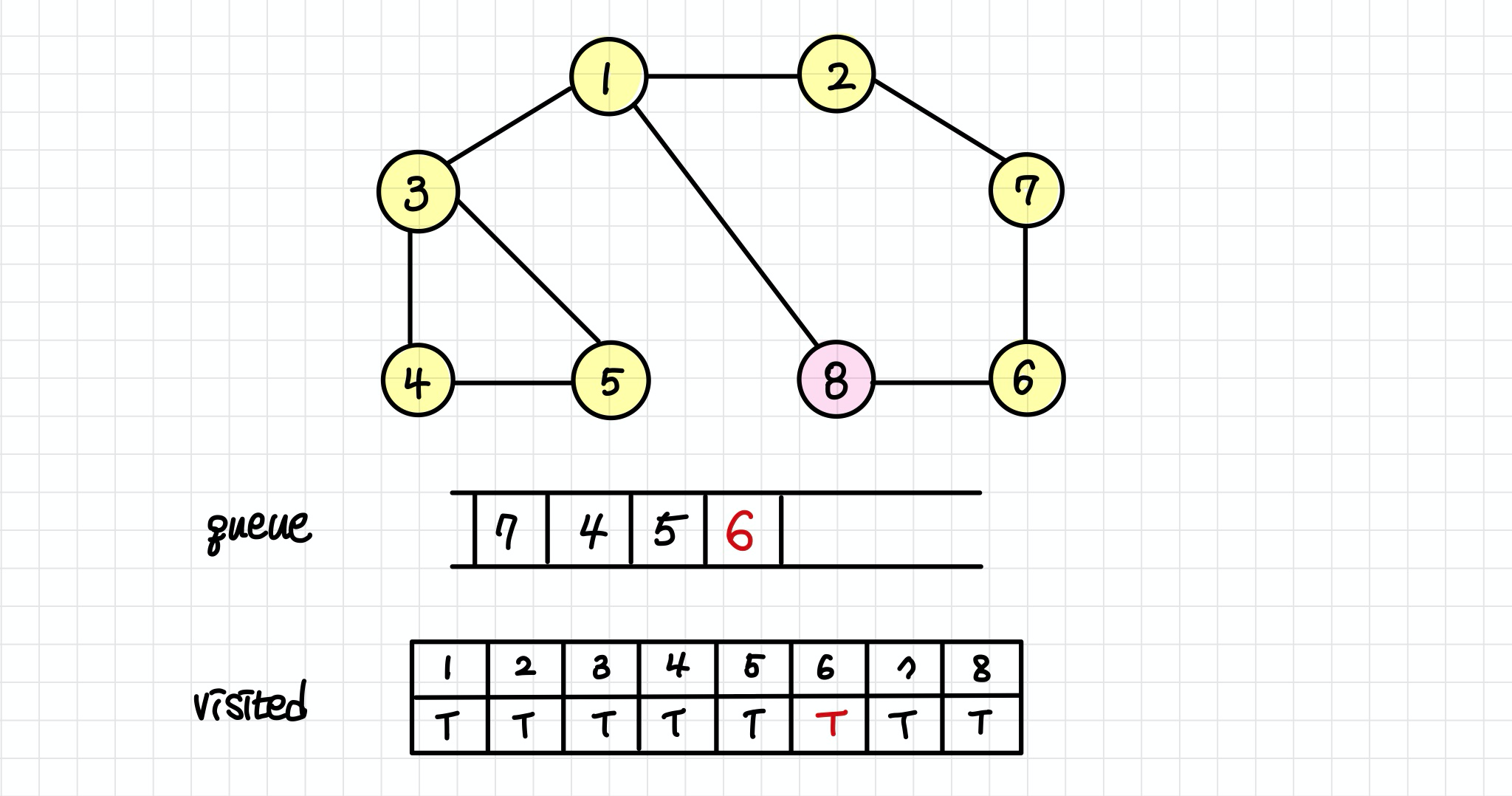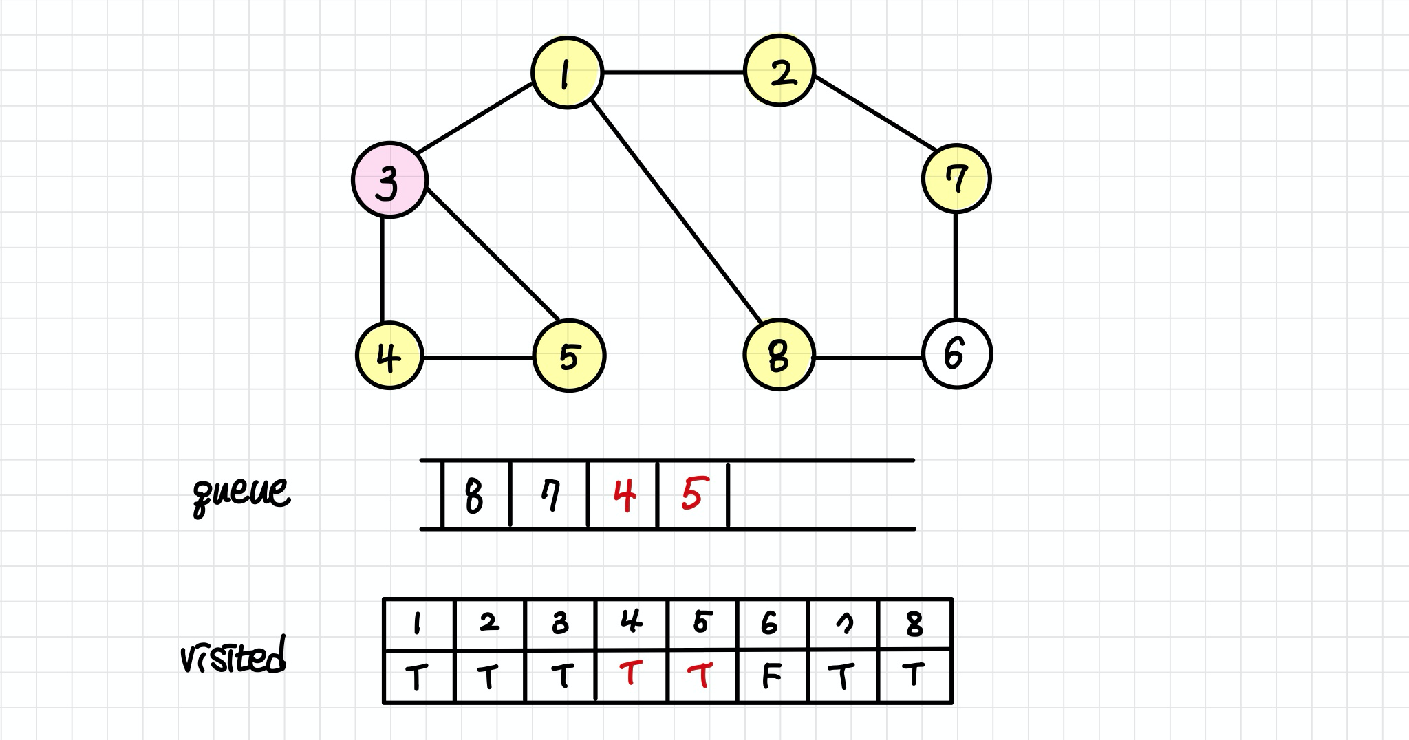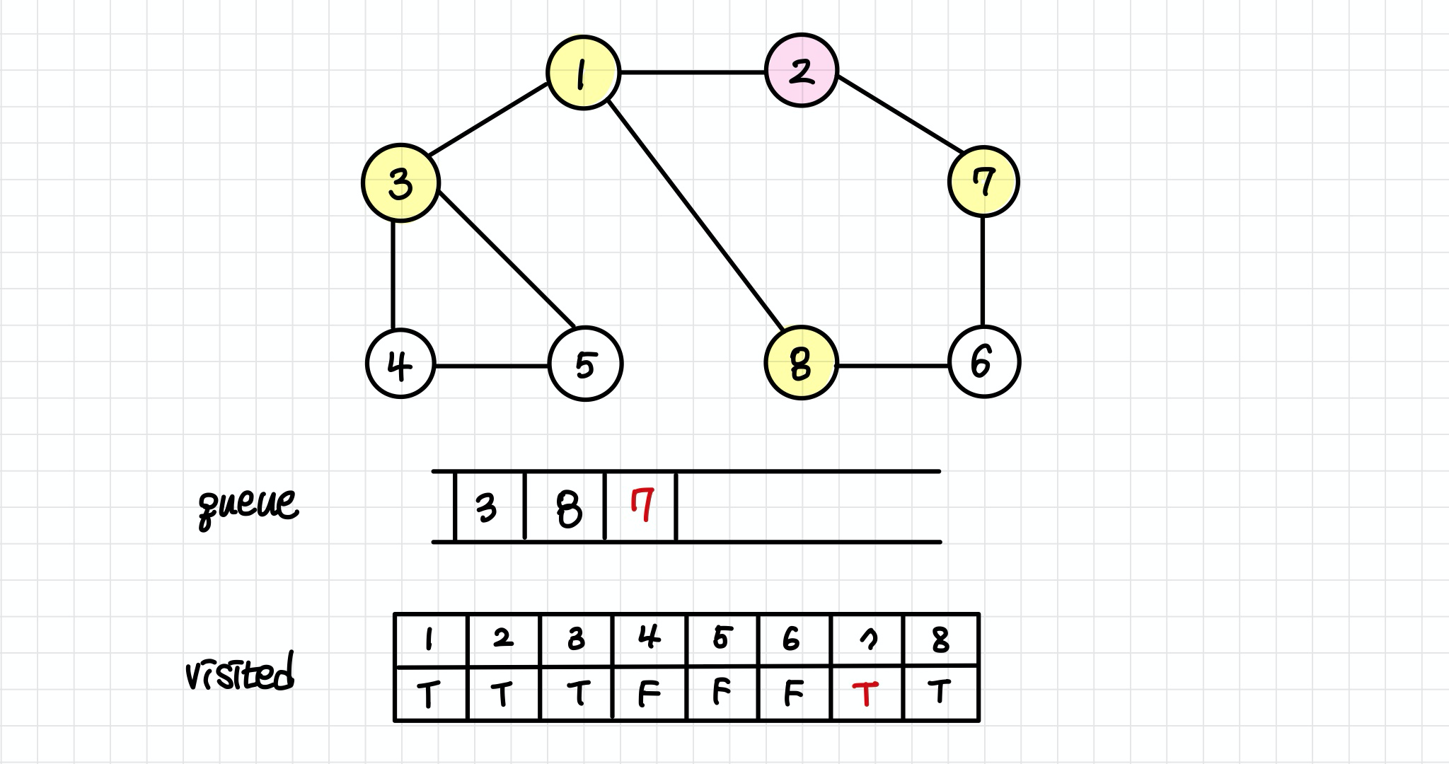 2. 큐에서 노드를 꺼내 해당 노드의 인접 노드 중에서 방문하지 않은 노드를 모두 큐에 삽입하고 방문 처리를 한다.