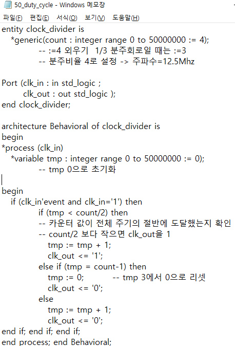 이 코드는 주파수를 4로 나누면서 동시에 50% 듀티 사이클을 유지하도록 설계되었습니다.