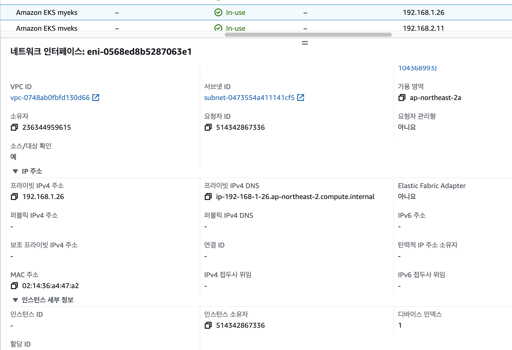 ENI는 내 인스턴스에(워커노드) 붙어있는데, 이 ENI의 소유자의 인스턴스 ID가 나와 다른 어카운트(AWS 매니지드)