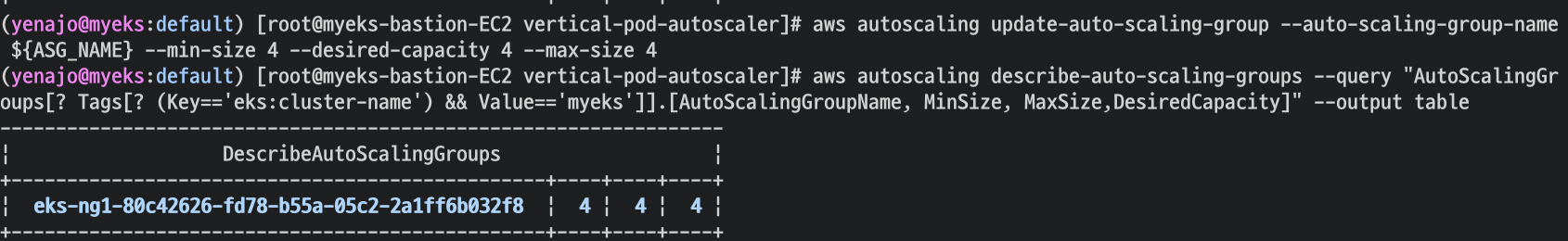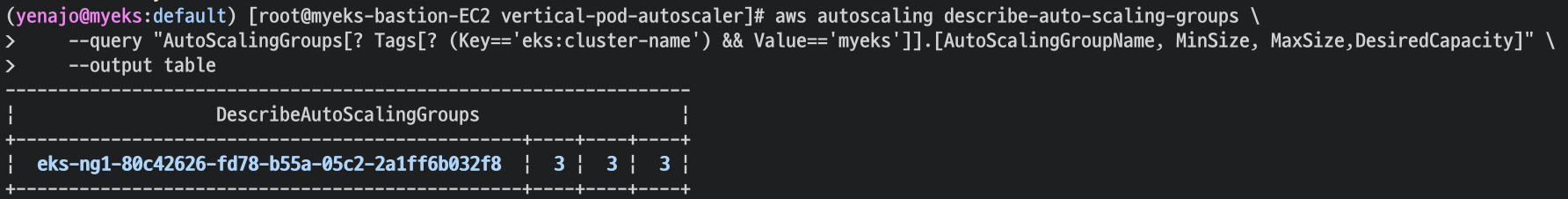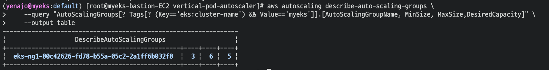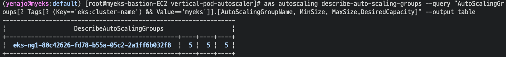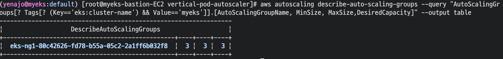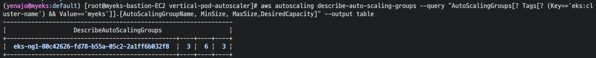 aws autoscaling describe-auto-scaling-groups --query "AutoScalingGroups[? Tags[? (Key=='eks:cluster-name') && Value=='myeks']].[AutoScalingGroupName, MinSize, MaxSize,DesiredCapacity]" --output table