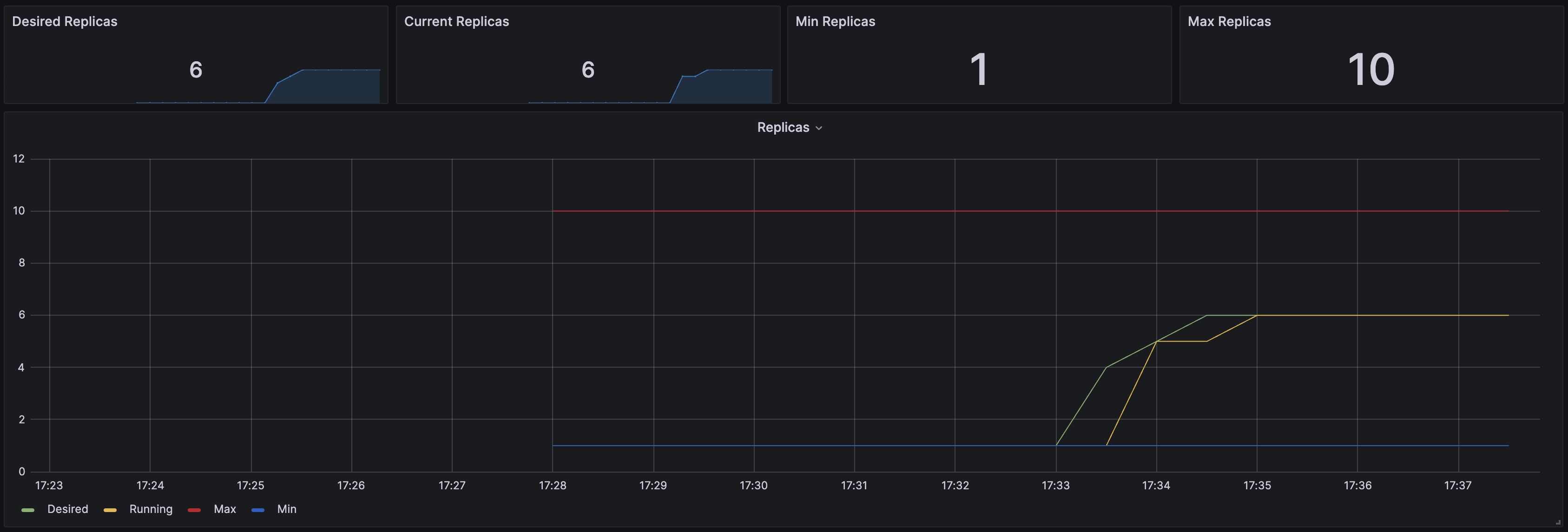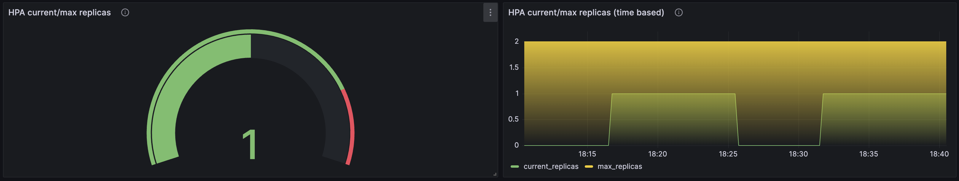 cron식으로 15분마다 replicas가 증가하게 해뒀기 때문에 잠시 다른것을 하다보면 grafana에서 아래와 같은 결과를 확인해볼 수 있다