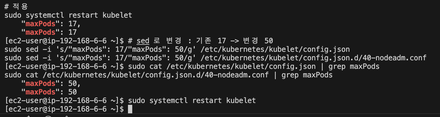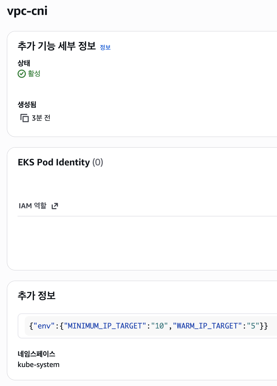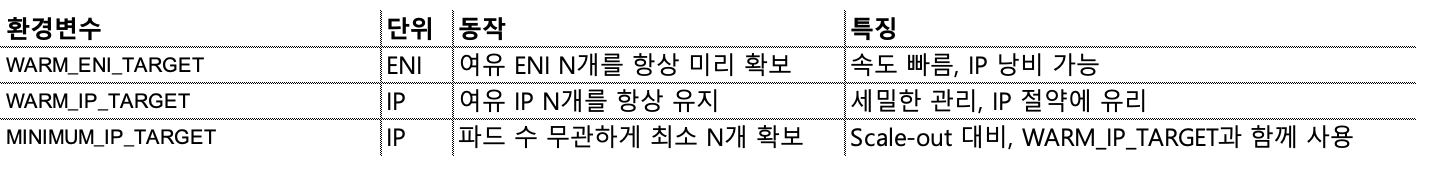 WARM_IP_TARGET = "5" # 현재 사용 중인 IP 외에 여유 IP 5개를 항상 유지, 설정 시 WARM_ENI_TARGET 무시됨