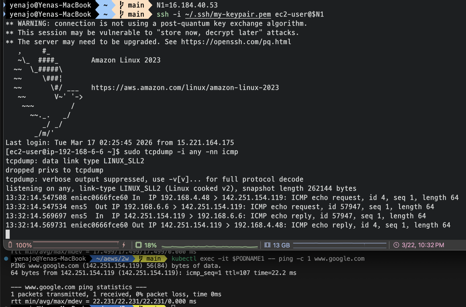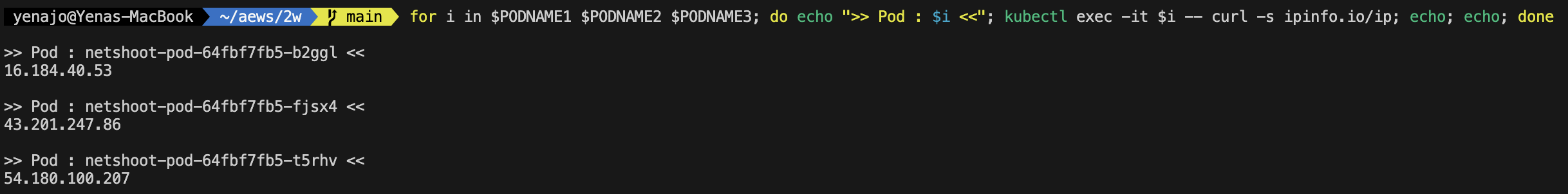 ▫️ pod도 외부랑 통신 할 땐 node와 마찬가지로 공인ip를 사용하는것을 아래 사진을 통해 확인할 수 있다