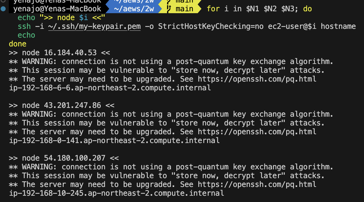 ssh -i ~/.ssh/my-keypair.pem -o StrictHostKeyChecking=no ec2-user@$i hostname