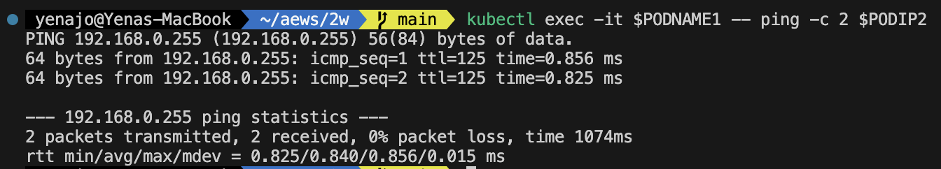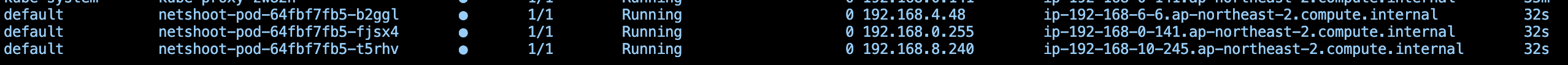 -> default ns 에 netshoot pod 가 각 node에 배포가 되었는데 하나의 pod에서 다른 pod로 통신을 어떻게 하는지 알아보는 단계