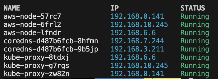 kubectl get pod -n kube-system -o=custom-columns=NAME:.metadata.name,IP:.status.podIP,STATUS:.status.phase