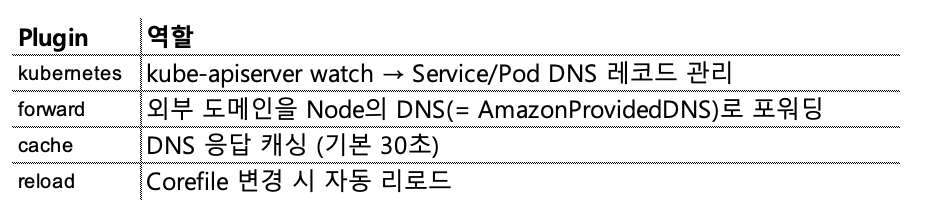 v1.11부터 kube-dns를 대체해 공식 기본 DNS로 채택되었으며, Go로 작성된 단일 바이너리로 plugin 체인 구조 덕분에 ConfigMap 수정만으로 기능 확장이 가능합니다.