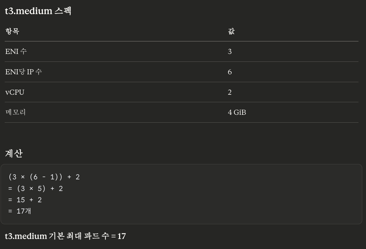 ▫️공식에 의해 t3.medium은 node 당 17개의 pod를 가질 수 있다.