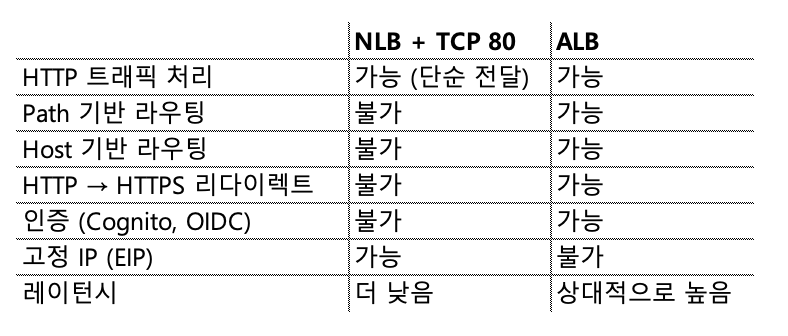 ▫️ NLB는 L4(TCP 레벨)에서 동작하지만, TCP 80 포트로 Listen하면 HTTP 트래픽도 통과시킬 수 있습니다