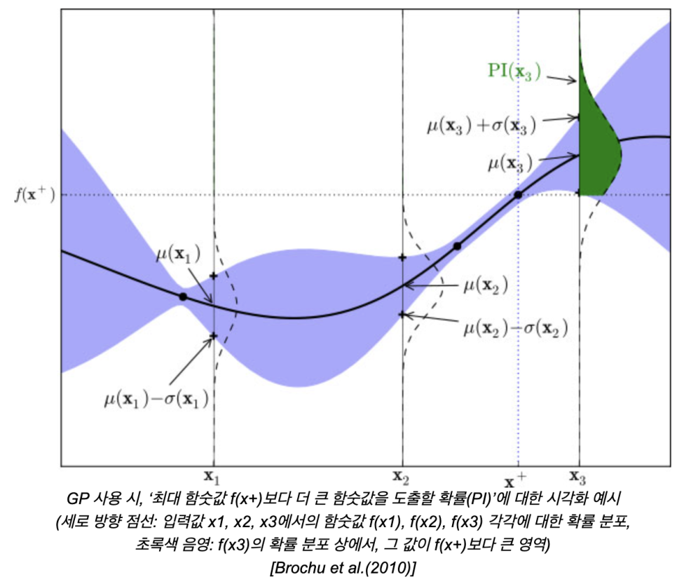 최대 함숫값보다 큰 영역에 해당하는 부분이 초록색으로 표시되어 있음. 이 영역의 크기가 클 수록, 이 때의 함숫값이 지금까지의 최댓값보다 클 확률이 높다. 그런 x값은 유용할만한 후보로 판단할 수 있다. 이렇게 계산한 PI값에 함숫값에 대한 평균과 지금까지의 최댓값과의 차이값만큼 가중하여 EI값을 최종적으로 계산. 그런 가능성이 존재할 때, 그 값이 실제로 얼마나 더 큰가 또한 고려대상이기 때문에 이를 반영한 계산 방식.
