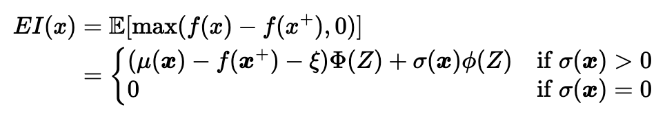 Expected Improvement(EI)는 exploration과 exploitation 두 전략 모두 일정 수준 포함하도록 설계된 것으로, Acquisition Function으로 가장 많이 사용된다. 현재까지 추정된 목적함수를 바탕으로 최대 합숫값보다 큰 함숫값을 도출할 확률 및 그 함숫값과의 차이값을 종합적으로 고려하여 입력값 x의 유용성을 나타내는 숫자를 출력한다.