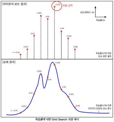 하이퍼파라미터 값들을 결정할 때, 논문에서 사용한 데이터셋과 내가 사용하고자 하는 데이터셋이 다르기 때문에, 완벽하게 적용되기 어렵다. 일반적으로 직관이나 노하우에 의해 다음 하이퍼파라미터 값을 선정하고, 학습을 수행하고, 검증 데이터셋에 대해 측정한 성능 결과를 기록한다. 마지막 시점까지 시도한 다음 가장 높은 성능을 발휘한 하이퍼파라미터 값들을 선정한다.