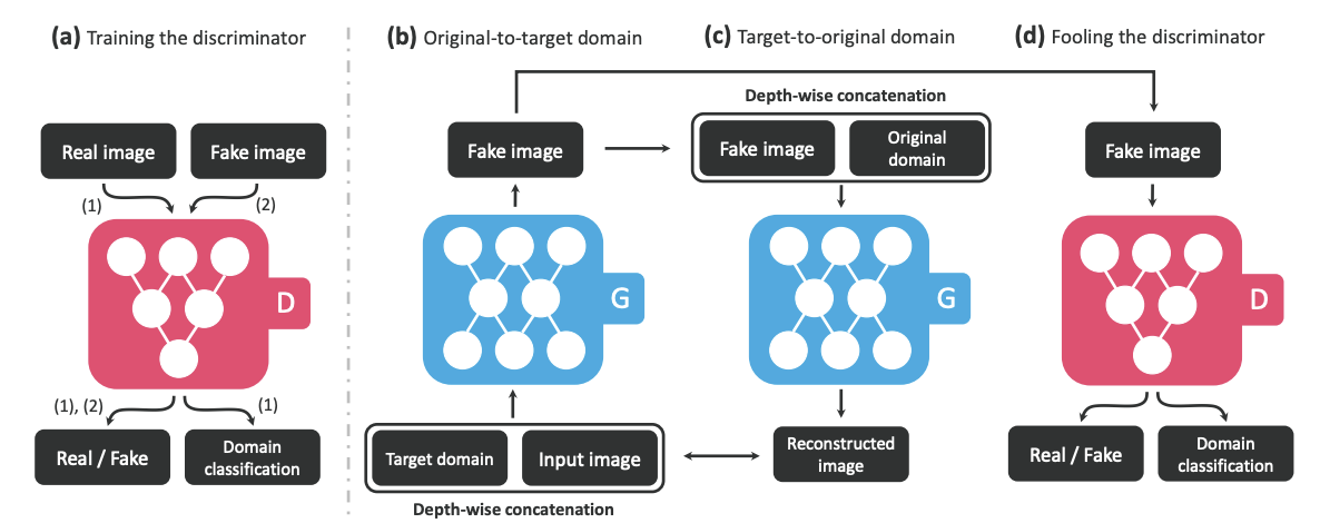 고정된 변환을 학습하는 대신, 이미지와 도메인 정보를 모두 입력으로 받아 입력 이미지를 해당 도메인으로 유연하게 변환하는 방법을 학습한다. StarGAN은 레이블(예를 들면 이진 또는 원-핫 인코딩 벡터)을 사용한다. 훈련 중에는 타겟 도메인 레이블이 무작위로 생성되고, 모델은 입력 이미지를 타겟 도메인으로 유연하게 변환하도록 학습되며, 이를 통해 도메인 레이블을 제어하고 테스트 단계에서 이미지를 원하는 도메인으로 변환할 수 있다.