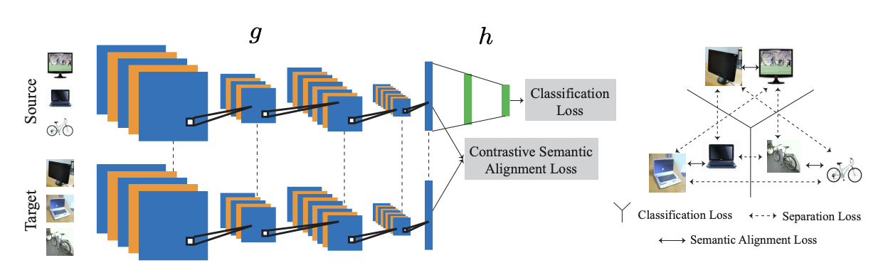 지도 도메인 적응에서는 타겟 도메인 데이터가 완전히 라벨링되어 있다. 타겟 도메인의 훈련 데이터가 그렇게 많지 않더라도 최적의 성능을 발휘할 수 있고, 라벨링 비용도 많이 들지 않는다. 논문 Unified Deep Supervised Domain Adaptation and Generalization에서는 분류 및 대조 의미 정렬(Classification and Constrastive Semantic Alignment, CCSA)손실을 도입한다. 입력 이미지는 딥러닝 모델을 사용하여 임베딩 / 특징 공간으로 매핑되며, 이를 바탕으로 분류 예측이 이루어진다.