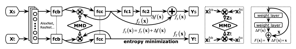 이 방법에서는 여러 계층을 심층 네트워크에 삽입하여 타겟 도메인 분류기와의 참조를 통해 함수를 명시적으로 학습함으로써 분류기 적응을 가능하게 한다. 이를 통해 소스 도메인 분류기와 타겟 도메인 분류기가 역전파 과정에서 밀접하게 연결할 수 있다. 이 외에도 여기저기 찾아보니, 소스 도메인과 타겟 도메인의 분류기를 연결하는 여러 방법들이 있었던 것 같다.