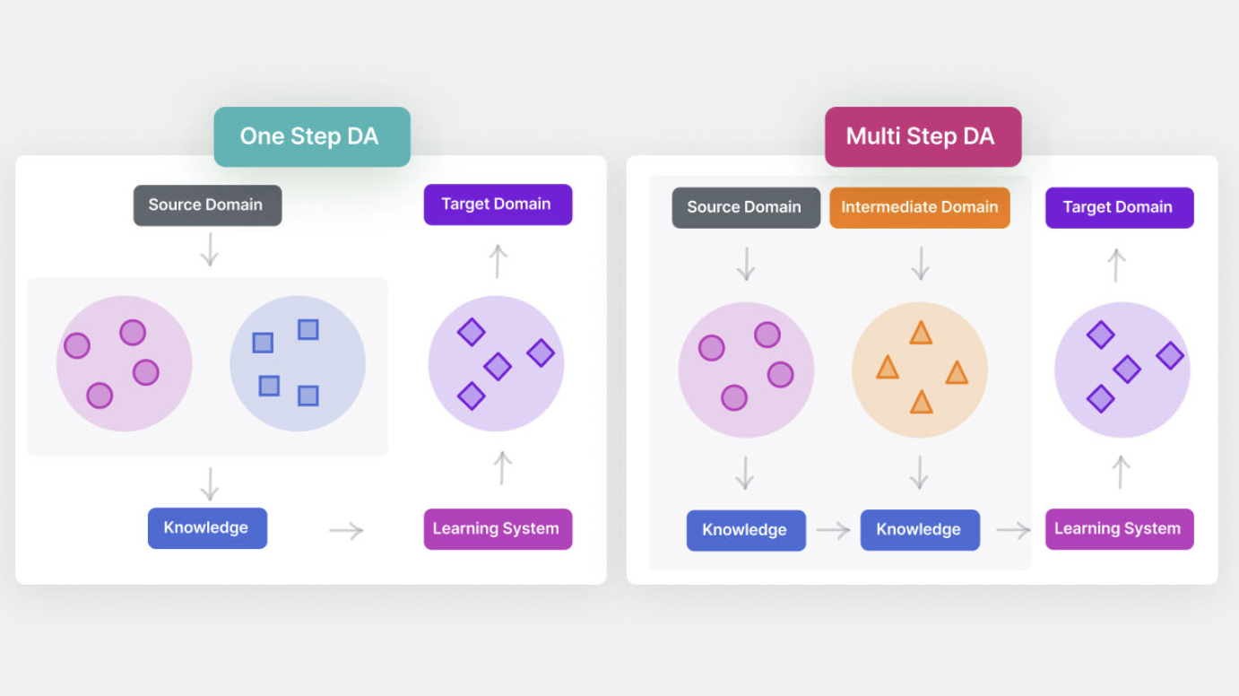 그러나 현실에서는 소스 도메인과 타겟 도메인의 겹침이 거의 없어 One-Step DA가 효과적이지 않을 수 있다. 다행히, 소스와 타겟 도메인을 원래 거리보다 가깝게 할 수 있는 중간 도메인이 존재하는 경우가 있다. 따라서 일련의 중간 다리를 사용하여 관련이 없어 보이는 두 도메인을 연결한 다음, 이 브릿지를 이용해 One-Step DA를 수행하는 방법을 Multi-Step DA라고 한다.
