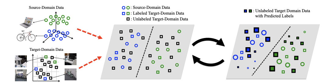 반복적 적응은 이름에서 알 수 있듯 타겟 도메인 데이터를 반복적으로 '자동 라벨링'하는 것을 목표로 한다. 그러나 이러한 방법은 일반적으로 라벨링된 타겟 샘플을 필요로 하므로, 지도 학습 및 반지도 도메인 적응 설정에 적합하다. 여기서 딥러닝 모델은 소스 도메인의 라벨링된 데이터로 훈련되고, 레이블이 없는 타겟 샘플을 주석 처리한다. 그런 다음, 새로운 타겟 도메인의 라벨링된 샘플로 새로운 모델을 학습한다.