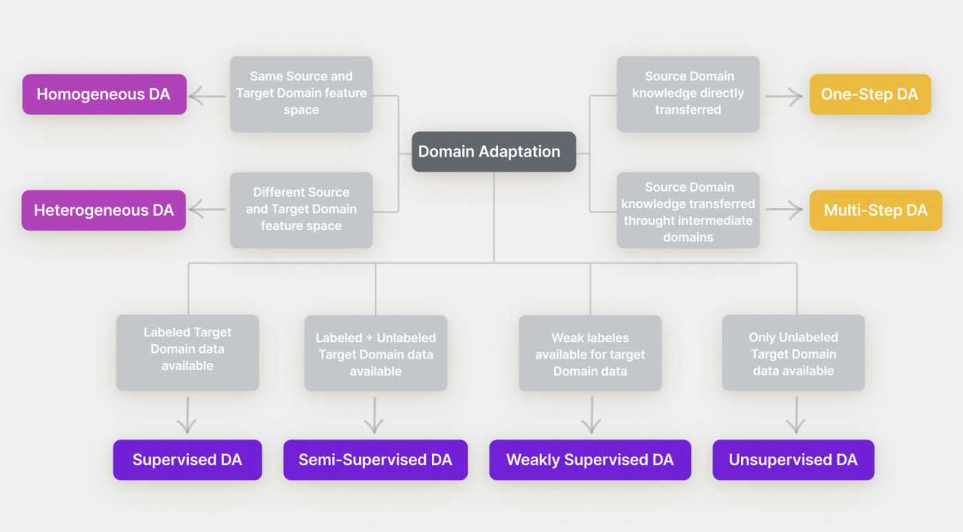 특징 기반 적응 기술은 도메인 간에 불변 특징을 추출하는 변환을 학습하여 소스 데이터를 타겟 데이터로 매핑하는 것을 목표로 한다. 이러한 기술은 일반적으로 원본 특징을 새로운 특징 공간으로 변환한 다음, 최적화 절차에서 도메인 간의 격차를 최소화하면서 원본 데이터의 기본 구조를 유지한다. 특징 기반 적응 방법은 다음과 같이 더 세분화될 수 있다.