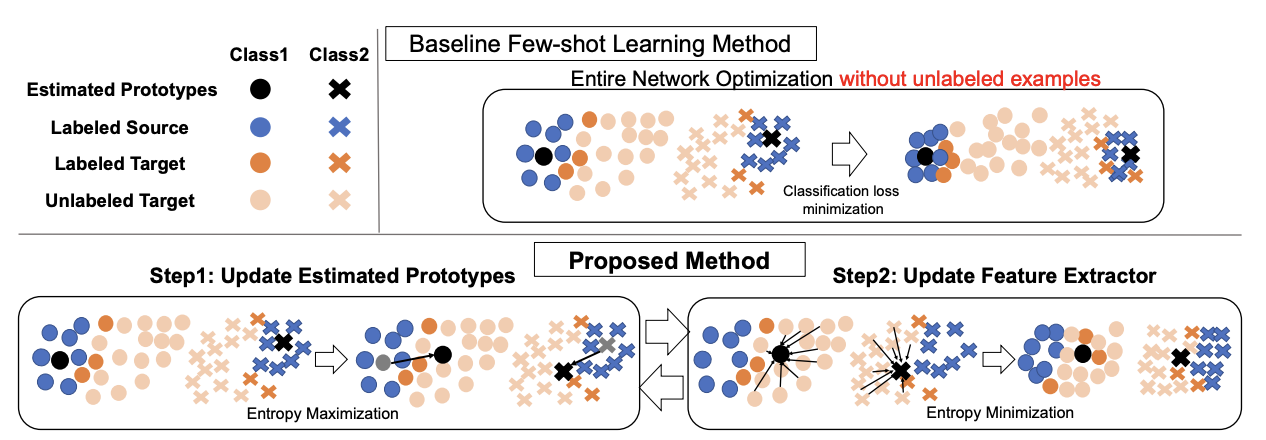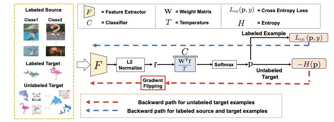 첫 번째 적대적 단계에서 레이블이 없는 타겟 예제의 엔트로피를 최대화하여 가중치 벡터를 타겟 쪽으로 이동시킨다. 이후 특징 추출기를 업데이트하여 레이블이 없는 예제의 엔트로피를 최소화하여 이들이 프로토타입 주위에 더 잘 클러스터링되도록 한다. 이 과정은 가중치 벡터와 특징 추출기 간의 미니맥스 게임으로 공식화되며 레이블이 없는 타겟 예제에 적용된다. 이 접근 방식의 개요는 아래 그림과 같다.