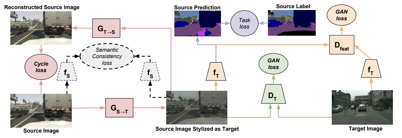 CyCADA: Cycle-Consistent Adversarial Domain Adaptation에서는 의미적 일관성을 강화하는 동시에 픽셀 수준과 피처 수준에서 표현을 적응시키는 CyCADA 모델을 제안했다. 사이클 일관성 손실(소스가 타겟으로 매핑되고 다시 소스로 매핑될 때 일치해야 함)과 특정 시각 인식 작업에 기반한 의미적 손실을 사용하여 구조적 일관성과 의미적 일관성을 모두 강화한다. 의미적 손실은 전체 표현이 차별적이게 되도록 안내하고 도메인 간 매핑 전후에 의미적 일관성을 강화한다.