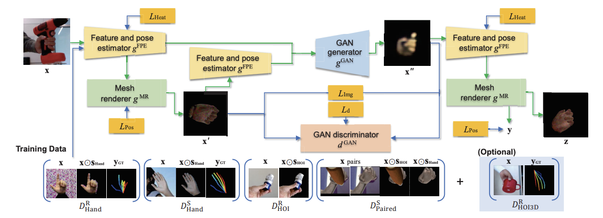 약한 지도 도메인 적응은 타겟 도메인에서 '약한 레이블'만 이용할 수 있는 문제 설정을 의미한다. 예를 들어, 의미적 분할 도메인 적응 문제에서, 타겟 도메인에서 실제 마스크를 사용할 수 없지만, 분할할 객체의 카테고리는 제공될 수 있다. 여기서 카테고리 레이블이 weak label이고, 실제 분할 마스크는 hard label이라고 부른다. 논문 Weakly-supervised Domain Adaptation via GAN and Mesh Model for Estimating 3D Hand Poses Interacting Objects는 이미지 공간에서 두 가지 지침을 사용하여 도메인 적응을 달성했다. 생성적 적대 신경망(GAN)과예측된 3D mesh와 텍스처를 사용하는 mesh renderer. 결과적으로 입력된 HOI 이미지는 분할되고 가려지지 않은 손만 포함된 이미지로 변환되어 HPE 정확도가 효과적으로 향상된다.