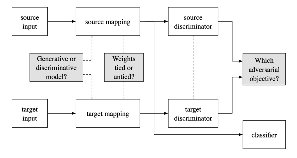 다양한 도메인 적응 방법이 결정 경계를 밀도가 낮은 밀도 영역으로 옮기기 위해 탐구되었고, 일반적으로 적대적으로 훈련된다. Adversarial Discriminative Domain Adaptation에서는 제목과 같은 ADDA라고 하는 비지도 DA 방법을 제안한다. 먼저 소스 도메인의 레이블을 사용하여 판별적 표현을 학습하고, 도메인-적대적 손실(domain-adversarial loss)을 통해 학습한 비대칭 매핑을 사용하여 타겟 데이터를 동일한 공간에 매핑하는 별도의 인코딩을 학습한다.