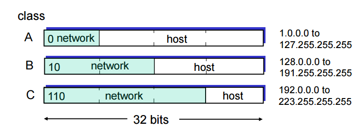 Network Part를 3가지로 나누어서 class를 구분한다. Network가 사용하는 Host의 수에 따라 class를 나누어서 운용한다. class가 낮아질수록 최대 host의 수는 감소하고 Network의 수는 증가한다.