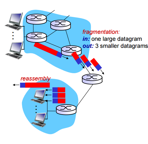 Network Link는 MTU(최대 전송 크기)를 가진다. 따라서 MTU보다 큰 Packet은 나누어서 보낼 필요가 있다. 나뉘어진 Packet들은 최종 도착지에서 다시 합쳐진다. 이를 위해 length, ID, fragflag, offset을 이용하여 Packet을 인지한다. Length를 이용하여 전체 Packet의 길이를 정의한다. fragflag와 offset을 이용하여 기다려야하는 Packet이 있는 지 확인한다.
