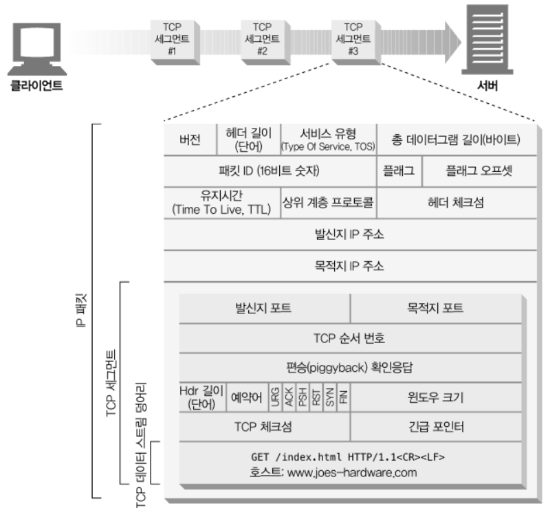 TCP는 IP 패킷(or IP 데이터그램)이라고 불리는 작은 조각을 통해 데이터를 전송한다.