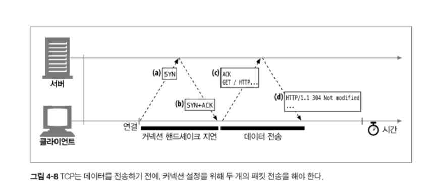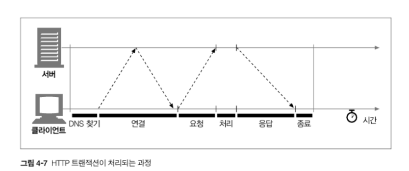 트랜잭션을 처리하는 시간은 다른 작업에 비하면 상당히 짧다. 클라이언트나 서버가 너무 많은 데이터를 내려받거나 복잡하고 동적인 자원들을 실행하지 않는 한 대부분의 HTTP 지연은 TCP 네트워크 지연 때문에 발생한다.