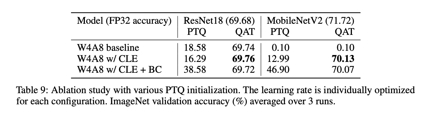 PTQ의 개선 기법들인 CLE와 bias correction가 QAT에 미치는 영향을 실험했다.