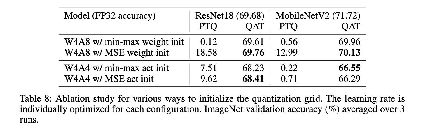 하지만 거의 모든 다른 경우에선, PTQ init은 최종적인 QAT 성능에 크게 영향을 미치지 않았다.