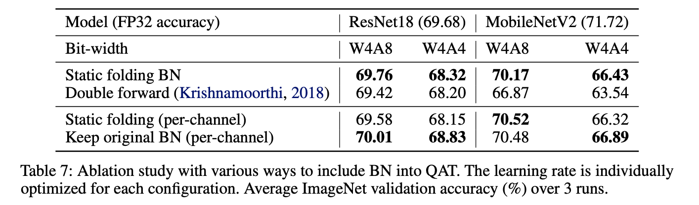 Table 7의 마지막 두 행에서 볼 수 있듯, static folding에 비해 per-channel quantization에 더 좋은 성능을 보임을 알 수 있다.