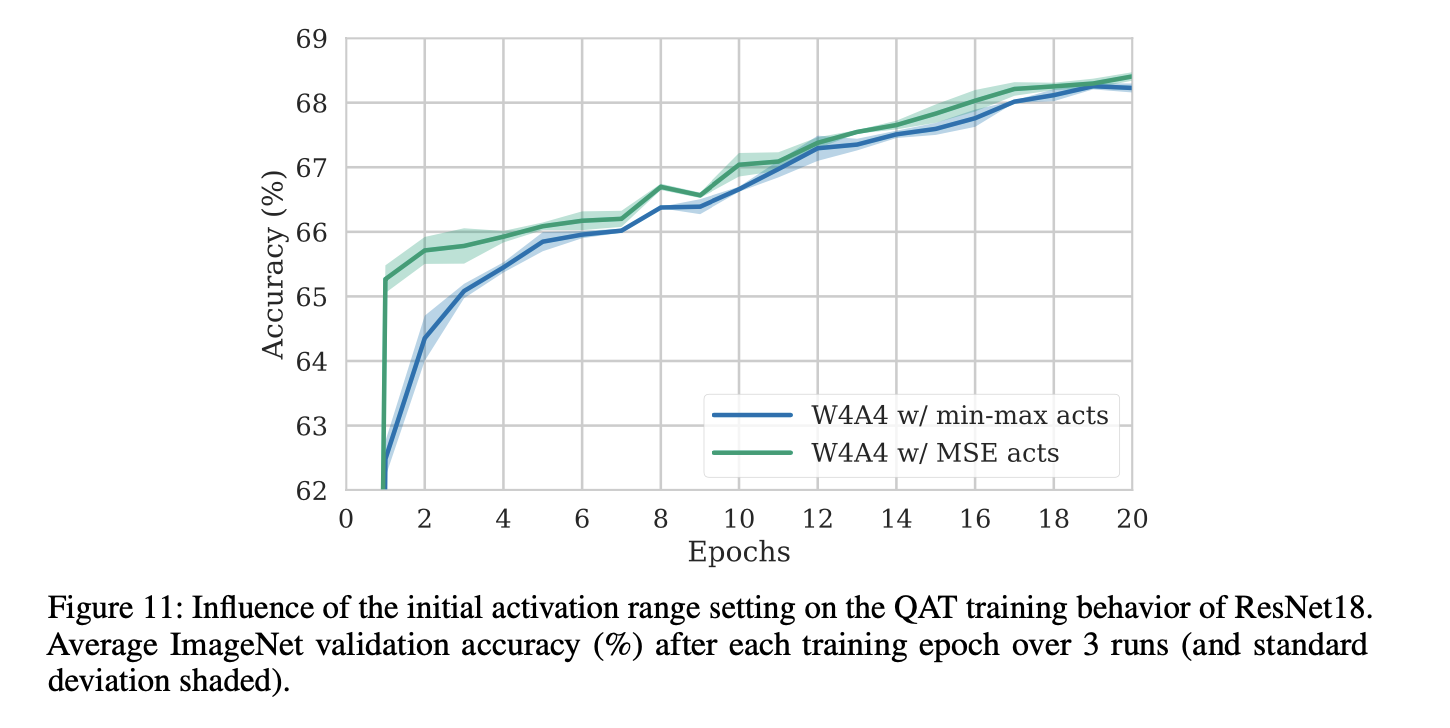 결과: weight quantization 실험과 유사하게, MSE init이 초기에 더 높은 accuracy를 보이지만, 20 epoch training 후 차이가 줄어들었다.