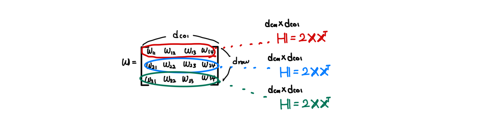 따라서 서로 다른 row 간에는 Hessian 상호작용이 없으며, 의 row 각각에 해당하는 개별 Hessian들만으로 작업하면 충분하다.
