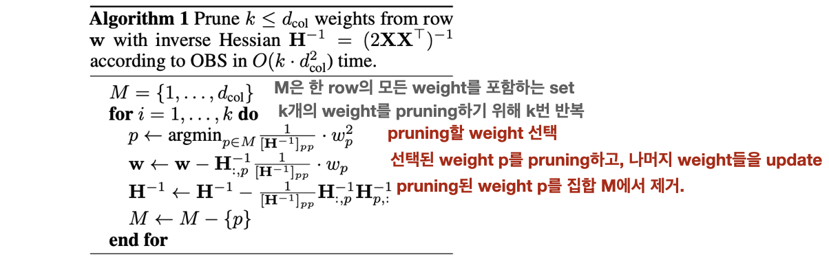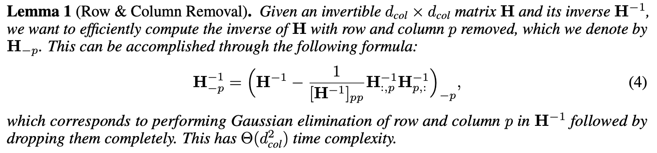 (b) 각 step에서 단순히 row 별로가 아니라, 전체 matrix의 minimum score weight를 pruning하고자 하므로, 모든 개 row의 Hessian inverse에 빠르게 접근해야 한다.