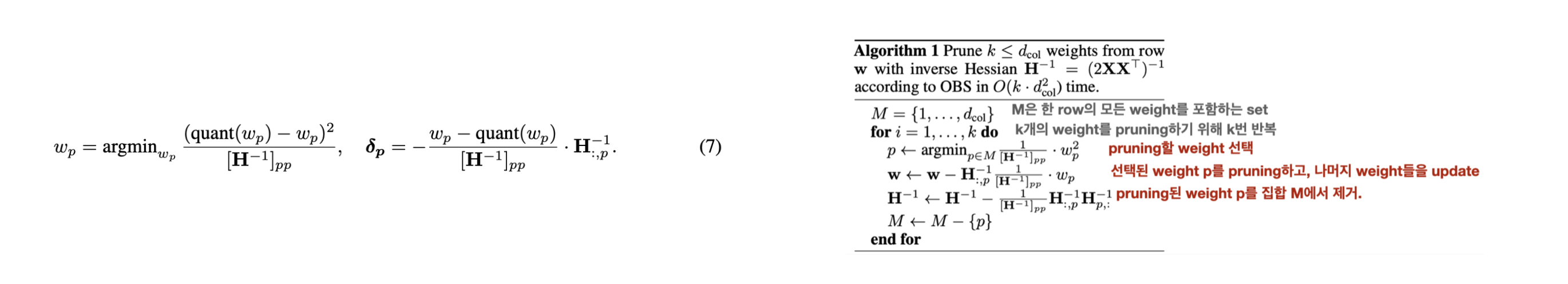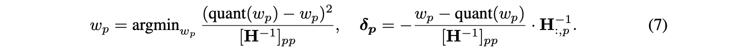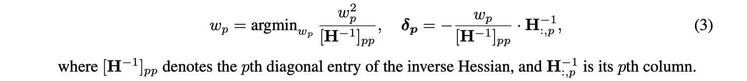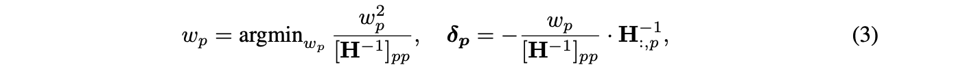 더 정확히 말하면, 를 주어진 (dense) model에서의 loss의 Hessian matrix라고 하면, loss의 증가를 최소로 야기하는 pruning할 weight 와 이에 대응하는 remaining weight의 update 는 다음과 같이 계산될 수 있다.
