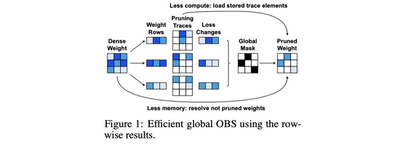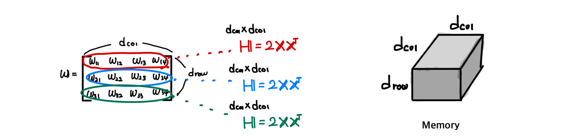 OBS를 각 row에 independent하게 적용하는 것보다, 전체 weight matrix에 적용하는 것은 모든 row의 inverse Hessian에 빠르게 접근해야 하므로, memory 측면에서 비용이 많이 든다.