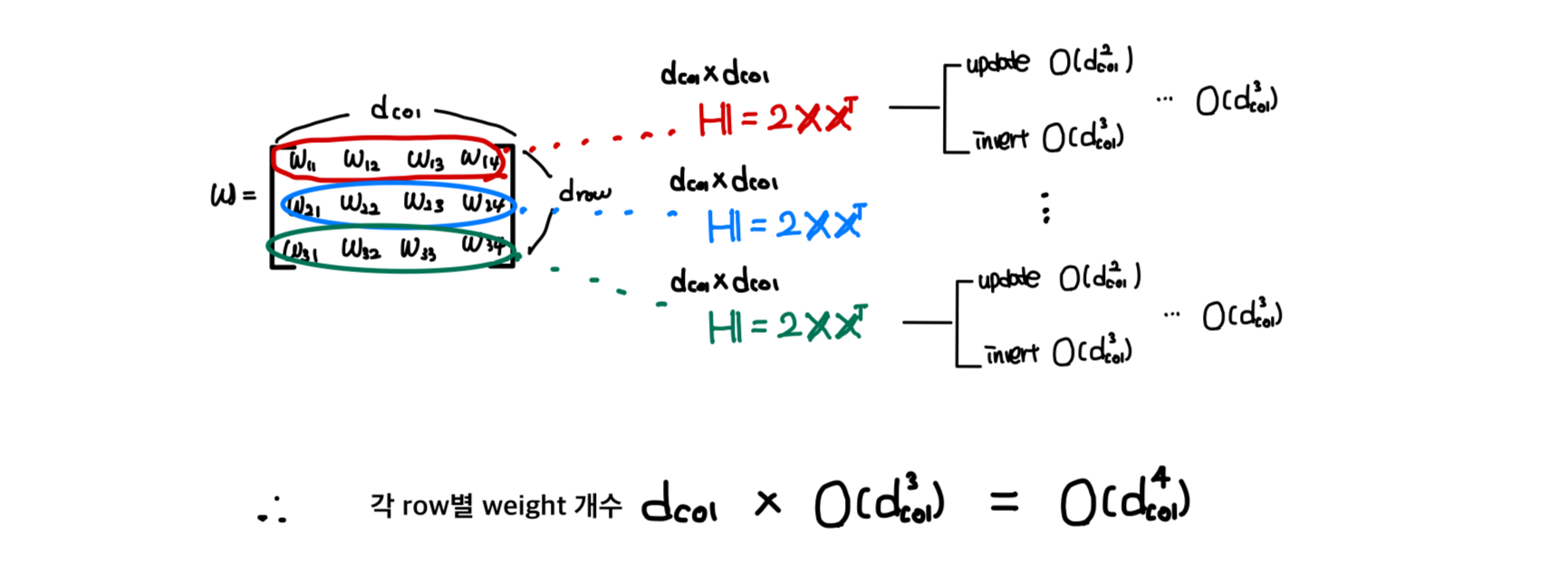 이 알고리즘이 의 single row에 OBS를 적용하며 per-step cost가 이고,