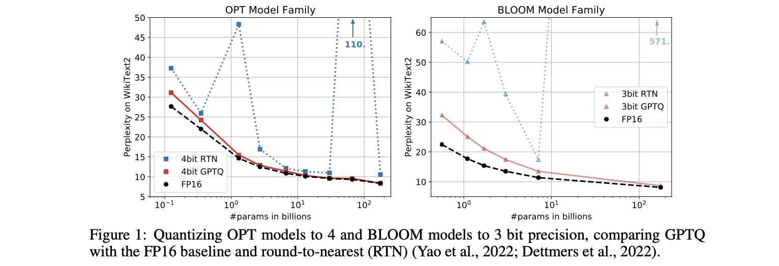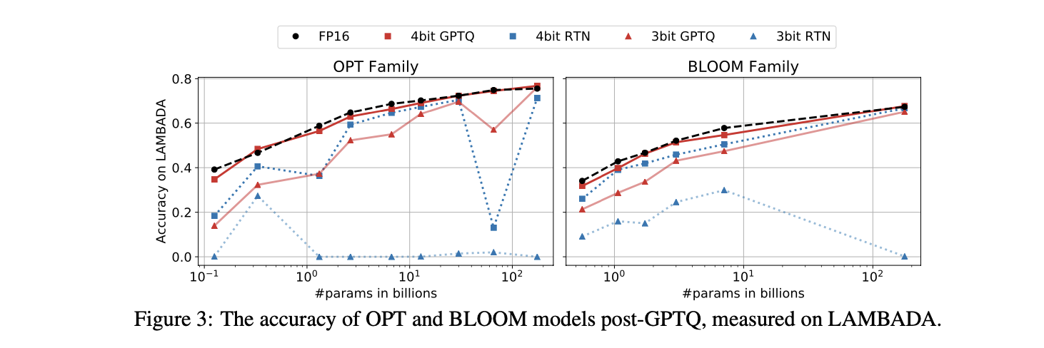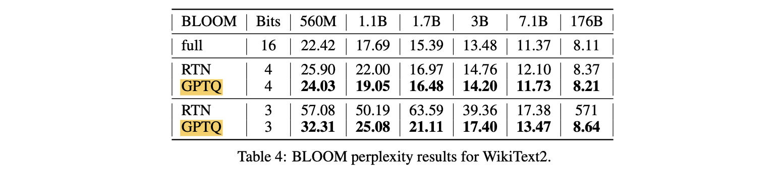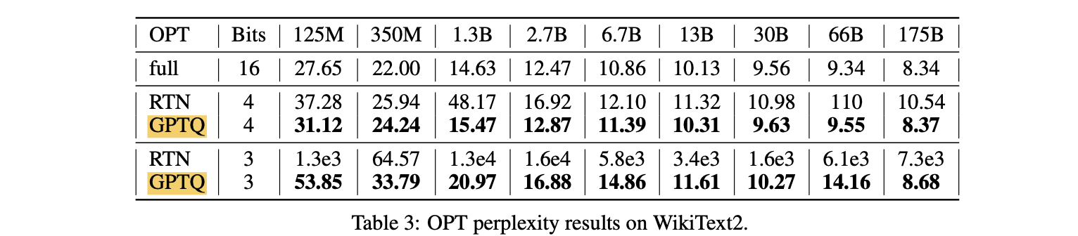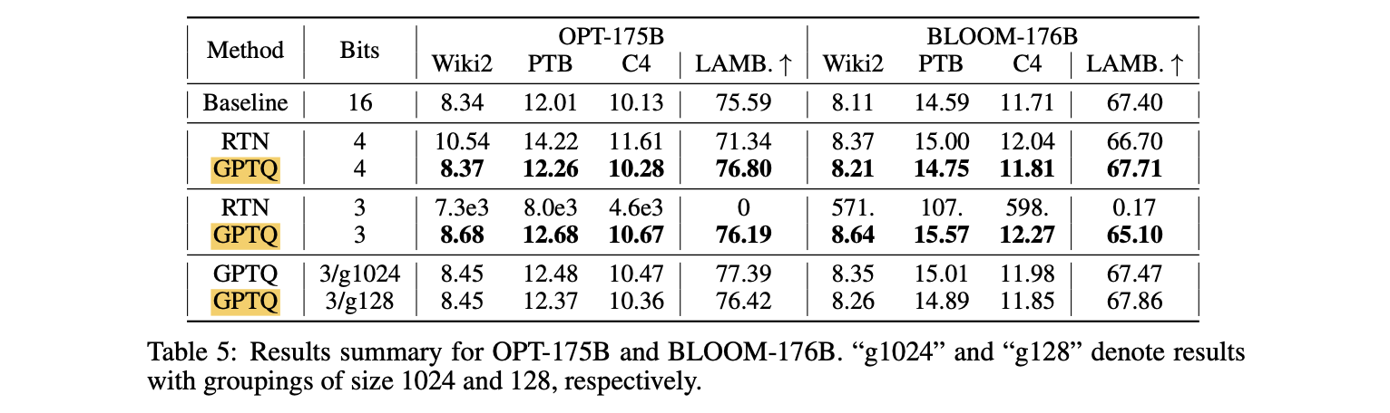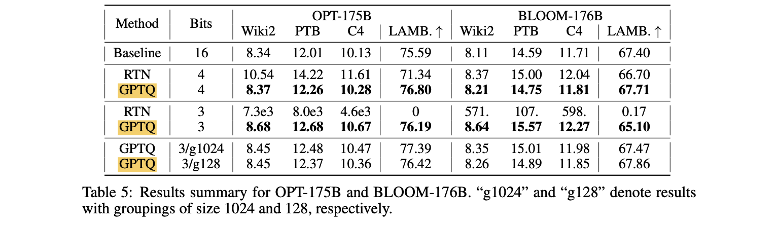 GPTQ는 small model에 대해서는 이러한 method들과 competitive하면서도 OPT-175B와 같은 huge model로도 scaling 가능함을 보여준다.