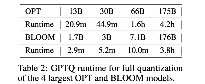 large model들에 대한 GPTQ의 runtime scaling을 실험한다.