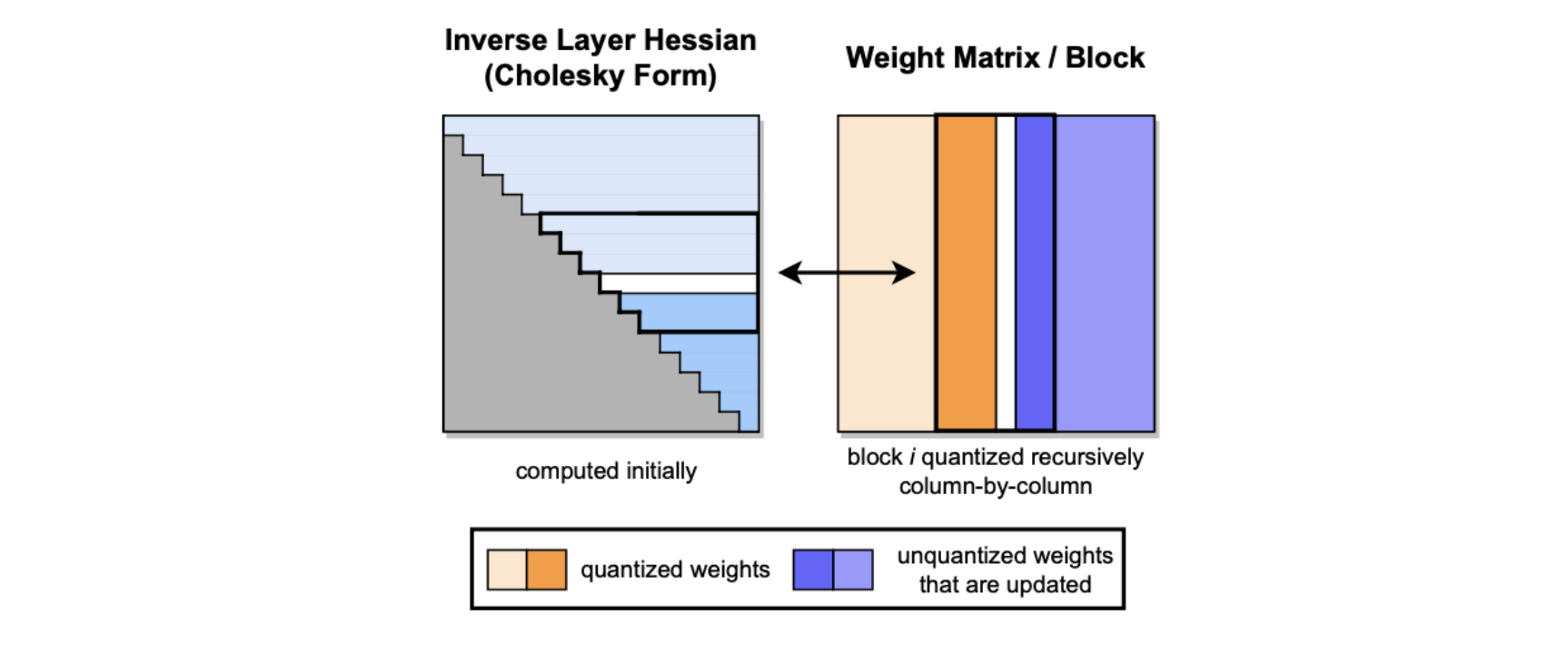 GPTQ는 한 번에 의 column에 알고리즘을 적용하며, updates를 해당 column들과 의 해당 블록으로 제한한다. (Figure 2)