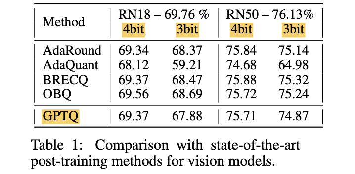 ablation study 1: ResNet18과 ResNet50에 대해 GPTQ의 성능을 state-of-the-art post-training quantization (PTQ) method들과 비교.