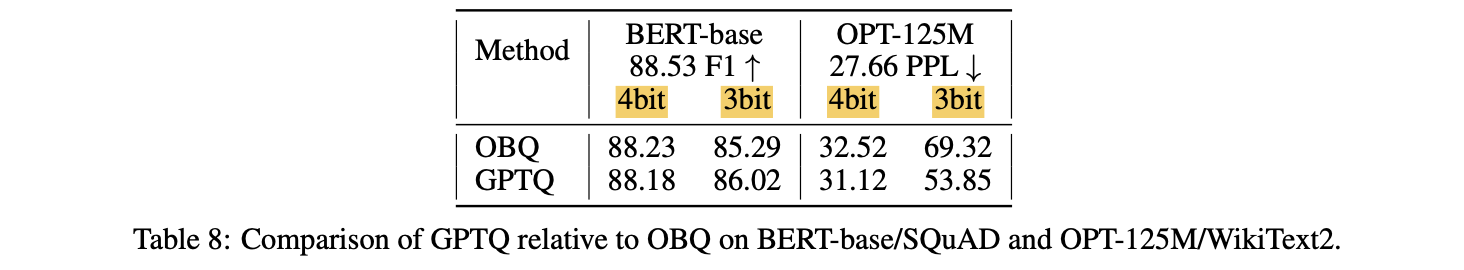 ablation study 2: 두 개의 smaller language model인 BERT-base (Devlin et al., 2019)와 OPT-125M에 대해 full greedy OBQ method와 비교