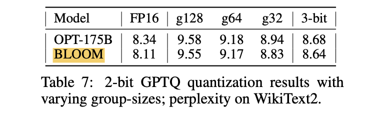 Table 7은 가장 큰 model들을 varying group-size로 2-bit로 quantize할 때 WikiText2에서의 결과를 보여준다.