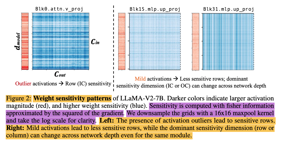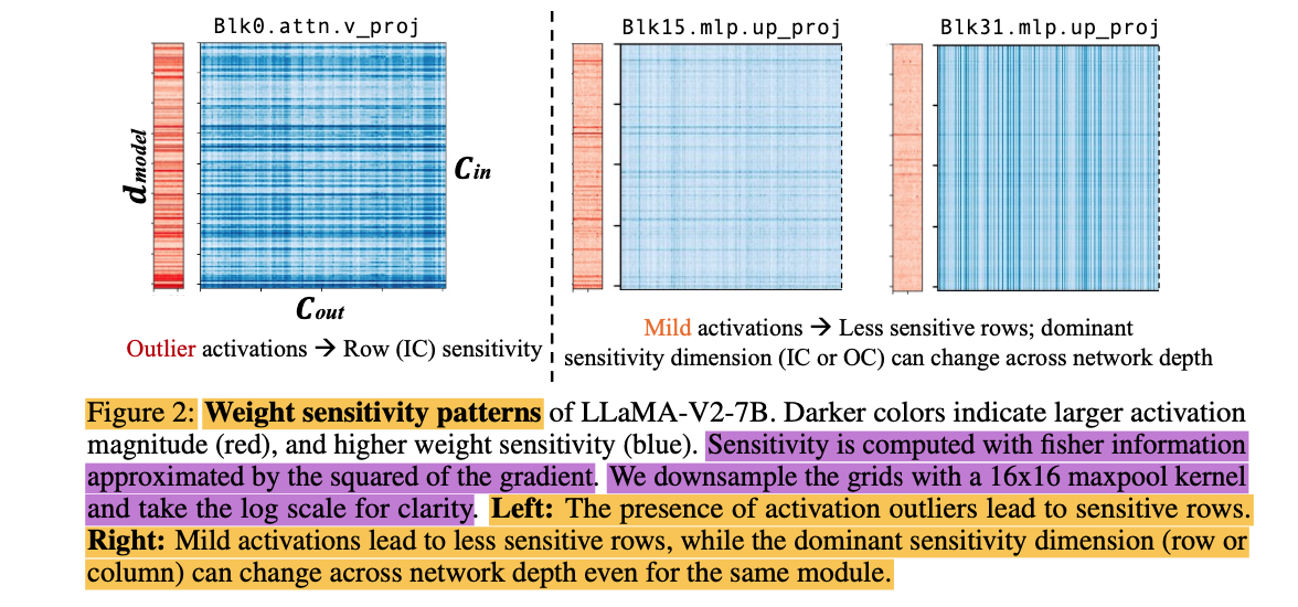 activation outliers가 발생하는 hidden dimensions는 weight chanels가 sensitive rows를 갖도록 하는 correlation을 가짐.