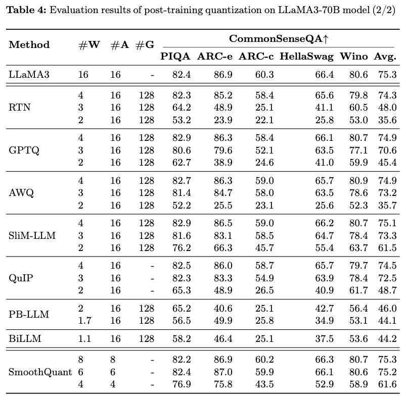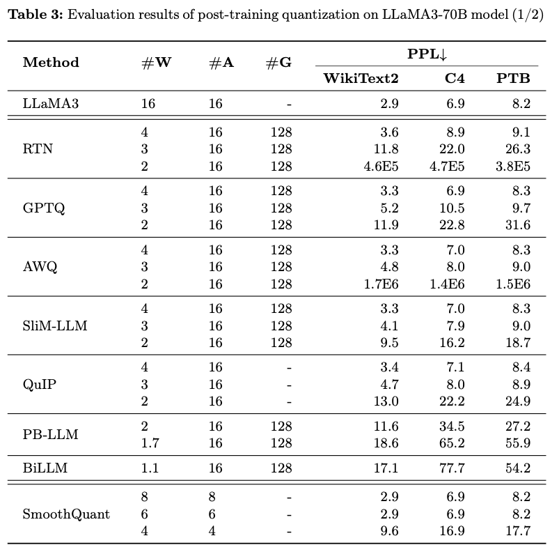 4-bit 이하에서 quantization된 LLaMA3에서 더 나쁜 성능을 보임.