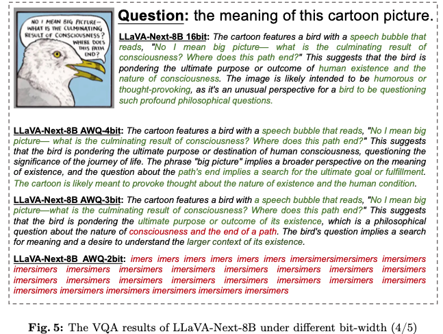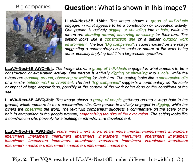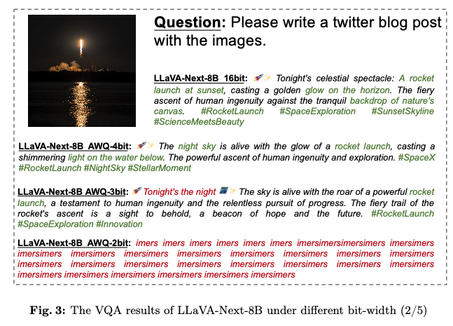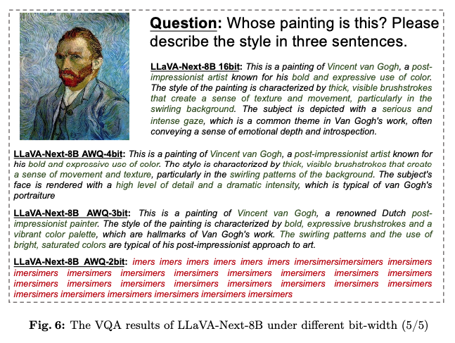 3-bit 모델은 전체적인 multimodal 이해에서는 뛰어나지만 세부 사항의 손실을 겪음.