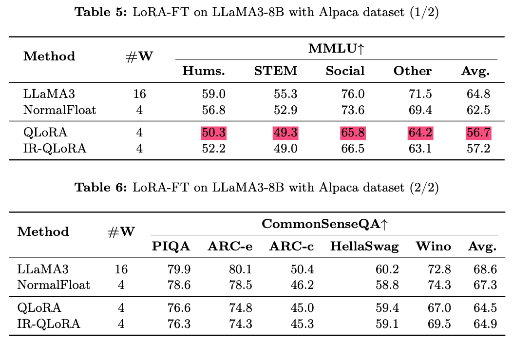 Alpaca [22] dataset에 대한 low-rank finetuning이 quantization으로 인해 발생한 오류를 보상할 수 없을 뿐만 아니라,